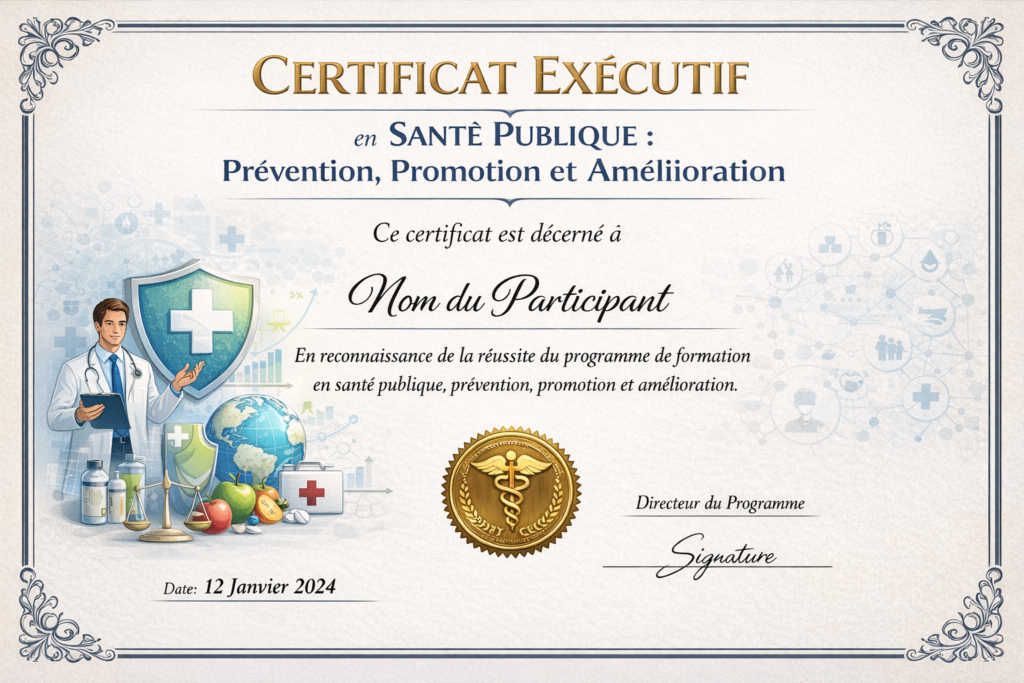 Les participants qui suivent l’intégralité du programme et réussissent l’évaluation finale se verront décerner une Certification en Santé Publique : Prévention, Promotion et Amélioration. Nos Certificats sont délivrés sous l’égide de Lead360 Consulting et en partenariat avec FMP Formation en Suisse.
